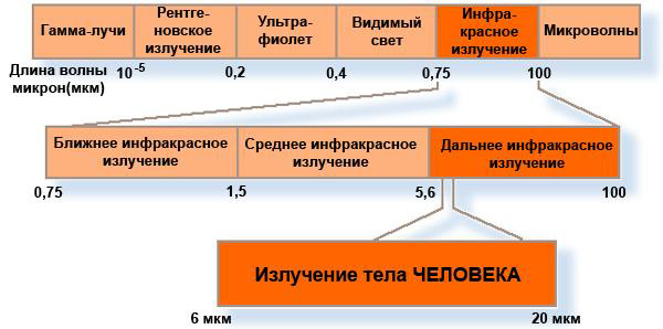 Инфракрасные (ИК) лучи - это электромагнитное излучение, подчиняющееся законам оптики и, следовательно, имеющее ту же природу, что и видимый свет. Эти лучи занимают спектральную область между красным видимым светом (длина волны 0,74 мкм) и коротковолновым радиоизлучением (1-2 мм). В свою очередь, инфракрасную область спектра условно разделяют на коротковолновую (от 0,74 до 2,5 мкм), средневолновую (2,5-50 мкм) и длинноволновую (50-1000 мкм) части. ИК-лучи выделяются всеми нагретыми твердыми и жидкими телами. При этом длина излучаемой волны зависит от температуры тела - чем она выше, тем короче волны и выше интенсивность излучения.